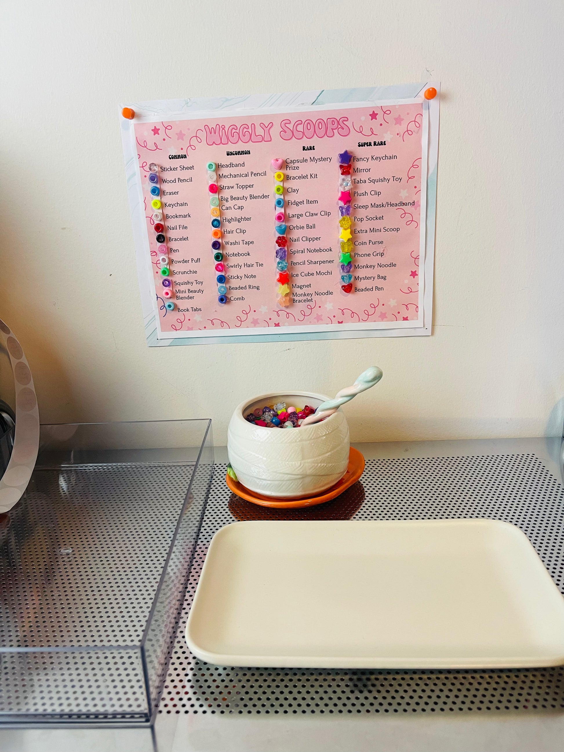 Once your order is received, we use a playful bead scooping system to pick your goodies. Scooping beads of different colors and shapes = different fun prizes you could win ranging from common, uncommon, rare and super rare!